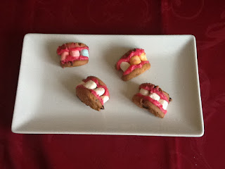 Ingredientes: 12 galletas con chips de chocolate , 30 mashmellows mini, 1 taza de azúcar powder, 1 taza de mantequilla a temperatura ambiente , colorante rojo y esencia de vainilla